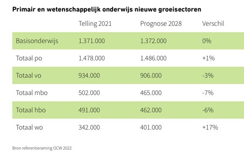 Van de leerling-daling en het veranderende keuzegedrag in het voortgezet onderwijs hebben mbo en hbo last. Beide sectoren schoten afgelopen jaar al opeens in de min en die trend zet door. Het studentenaantal in het mbo duikelt volgens de prognoses tussen 2021 en 2028 uiteindelijk met 37.000. Het hbo moet in diezelfde periode rekening houden met per saldo 28.000 studenten minder. Het wetenschappelijk onderwijs blijft door de steeds hogere deelname aan het vwo doorgroeien, zoals al werd verwacht.